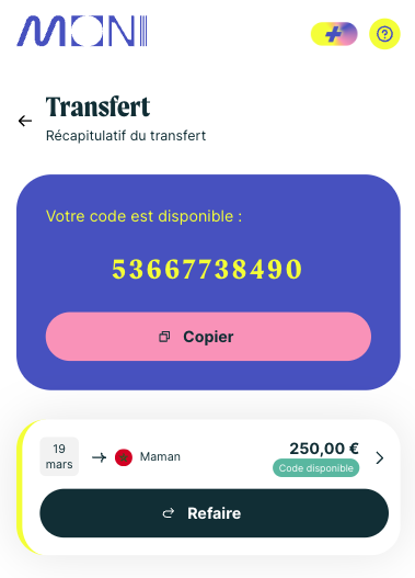 Vous serez averti par mail dès que les fonds sont disponibles et vous pourrez récupérer le code de retrait à transmettre à votre bénéficiaire sur votre espace client !